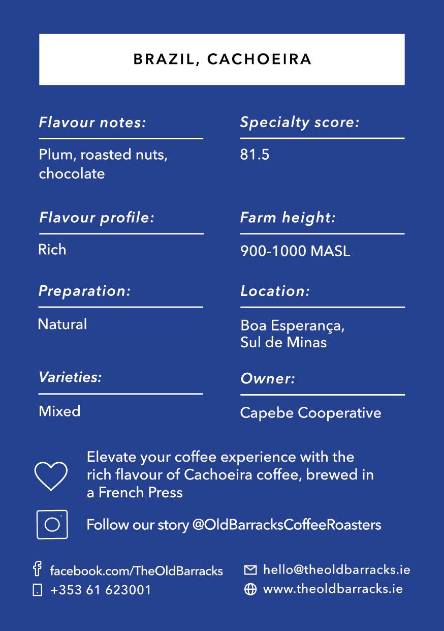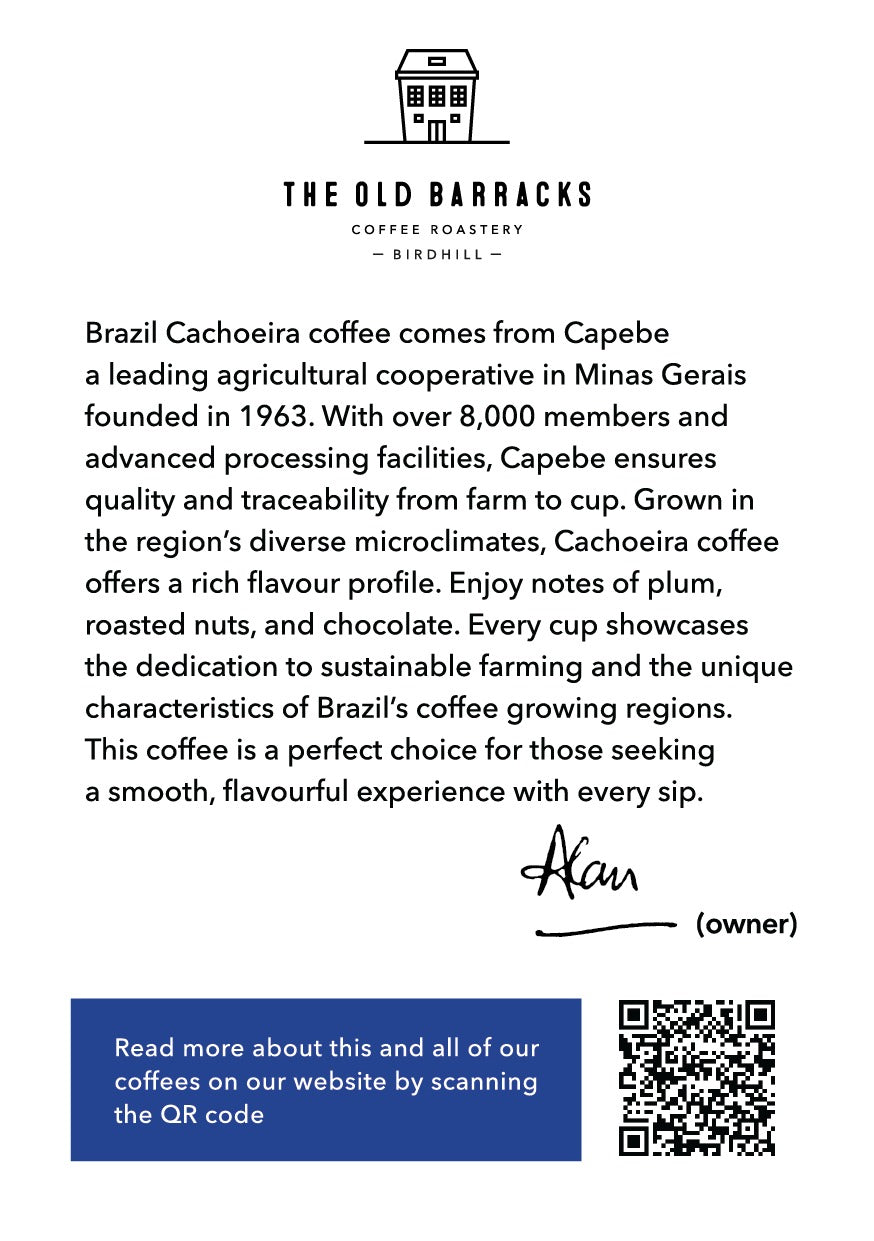 Brazil Cachoeira coffee comes from Capebe a leading agricultural cooperative in Minas Gerais founded in 1963. With over 8,000 members and advanced processing facilities, Capebe ensures quality and traceability from farm to cup. Grown in the region's diverse microclimates, Cachoeira coffee offers a rich flavour profile. Enjoy notes of plum, roasted nuts, and chocolate. Every cup showcases
